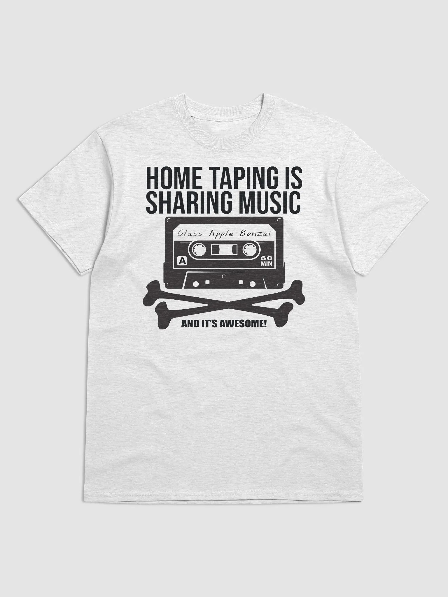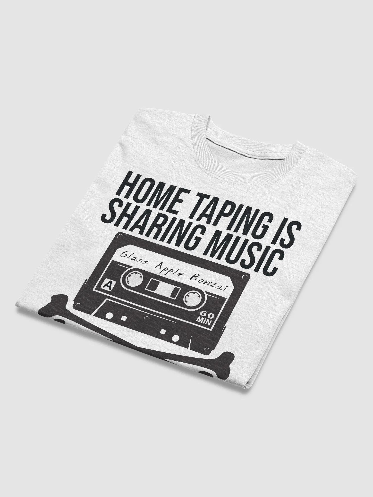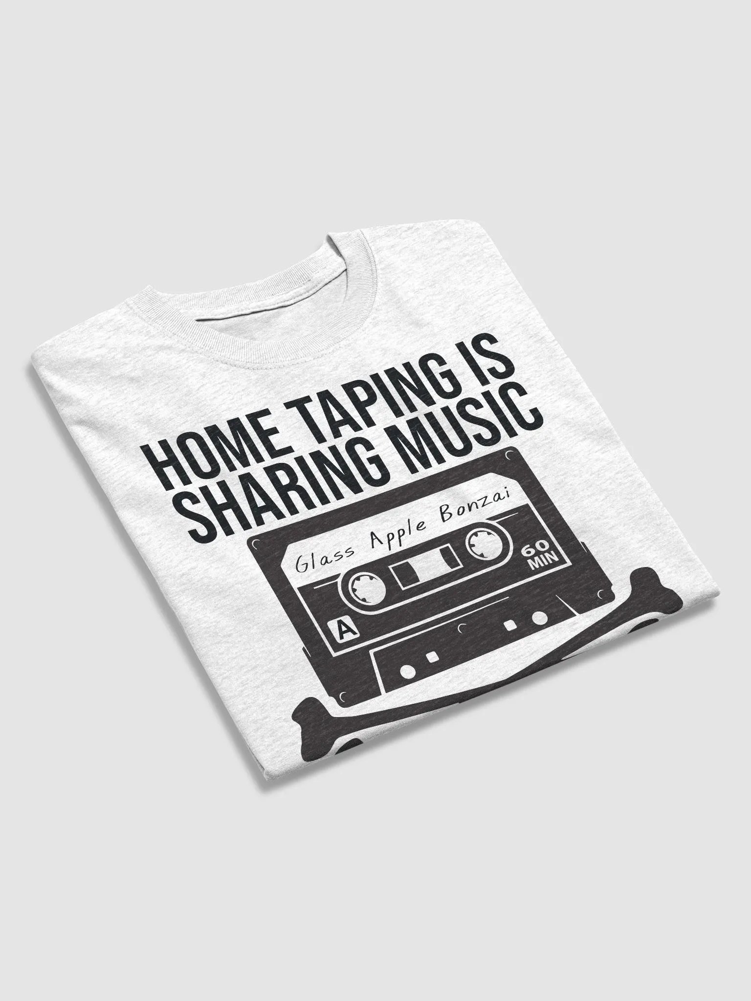 "Home Taping is Sharing Music" black print on a selection of coloured t-shirts